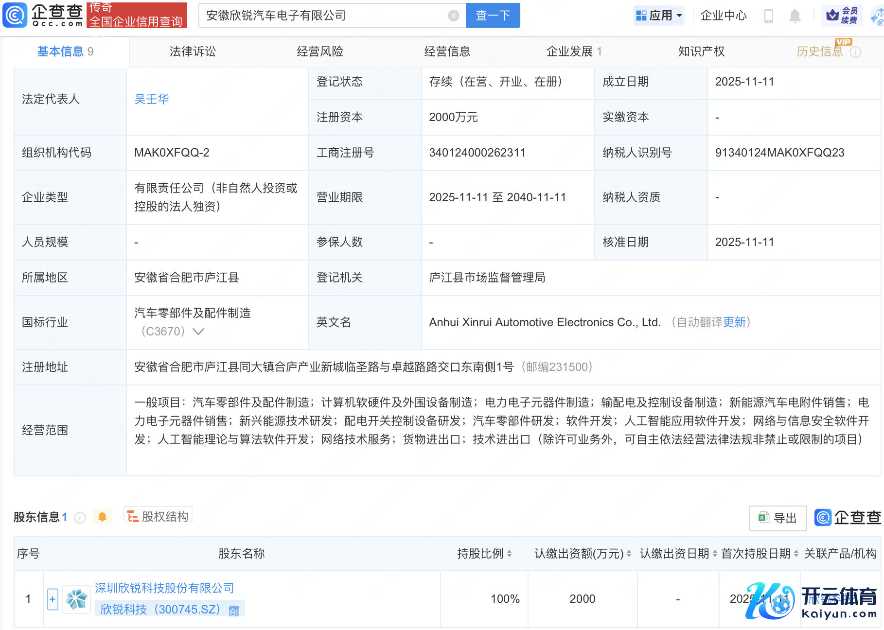 近日,安徽欣锐汽车电子有限公司诞生,注册本钱2000万元九游体育app官网,权术范围包含:东谈主工智能诈欺软件开拓;集合与信息安全软件开拓;东谈主工智能表面与算法软件开拓;集合时代处事等。企查查股权穿透露出,该公司由欣锐科技(300745)全资合手股。