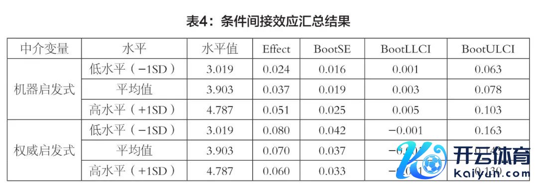 为了考证假定2-4,研究进一步在第三节中介效应被考证成立的基础上,进一步查考当调度变量存在时的模子变化情况。根据研究假定,研究基于Process Macro的模子14,以签字是否为AI算作自变量,是否签字算作限制变量,机器启发式、巨擘启发式算作中介变量,感知专科度算作因变量进行了调度中介分析。与中介效应考证一致,获胜效应不显赫,巨擘启发式、机器启发式的完全中介效应显赫,条目转折效应汇总终结如表4所示。