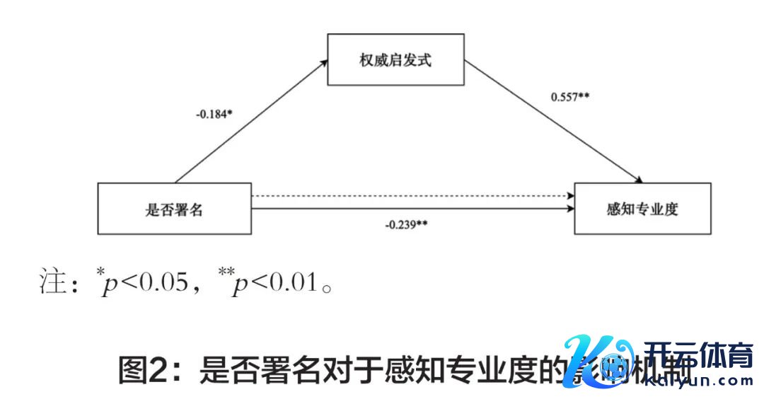 最初,如图2,关于“是否签字”,其与感知专科度之间的总效应显赫,获胜效应不显赫,巨擘启发式起到了完全中介效应,而机器启发式的中介效应不显赫,维持研究假定2-1。其中,总效应悉数为-0.239,签字与否通过负向影响巨擘启发式,进而对感知专科度变成负面影响。从这少许来看,当受众通过启发式领略和处答理经驳斥时,虽然巨擘启发式能灵验地正向影响受众关于驳斥的专科度感知,但具体的签字反而关于受众的巨擘启发式领略起到的却是负面影响,这事实上反应了刻下中国财经专科媒体的公信力的松开。